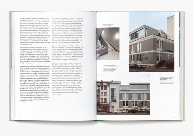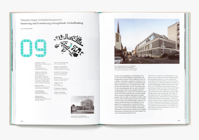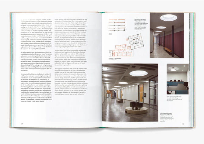 "Die vermeintliche Selbstverständlichkeit, mit der Alt und Neu eine gelungene Liaison eingehen, zeigt sich exemplarisch an der ausgeklappten Fensterfront an der Stirnseite des Mittelflurs der Aufstockung. In Diskussionen mit Bauherrschaft und Denkmalpflege und in vielen Entwurfsvarianten entwickelt, nimmt sie die Fassadenachse des zum Saalbau verdrehten Verwaltungsgebäudes auf und belebt so den Aufsatz entscheidend: Es erhebt ihn über eine pragmatische Aufstockung und zeigt, dass hier weit mehr geleistet wurde, als den Bestand lediglich fortzuschreiben - er wurde nicht nur räumlich, sondern auch hinsichtlich des architektonischen Vokabulars erweitert. In dieser Mischung aus Respekt vor dem Bestand und selbstbewusster Fortschreibung taugt das Justizgebäude 2022 erneut als Vorbild - nicht nur in Bayern."