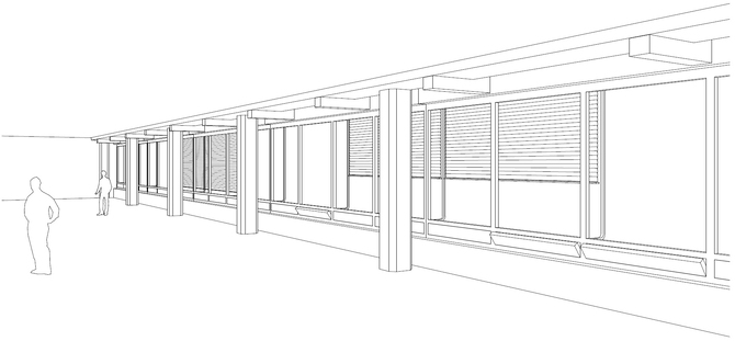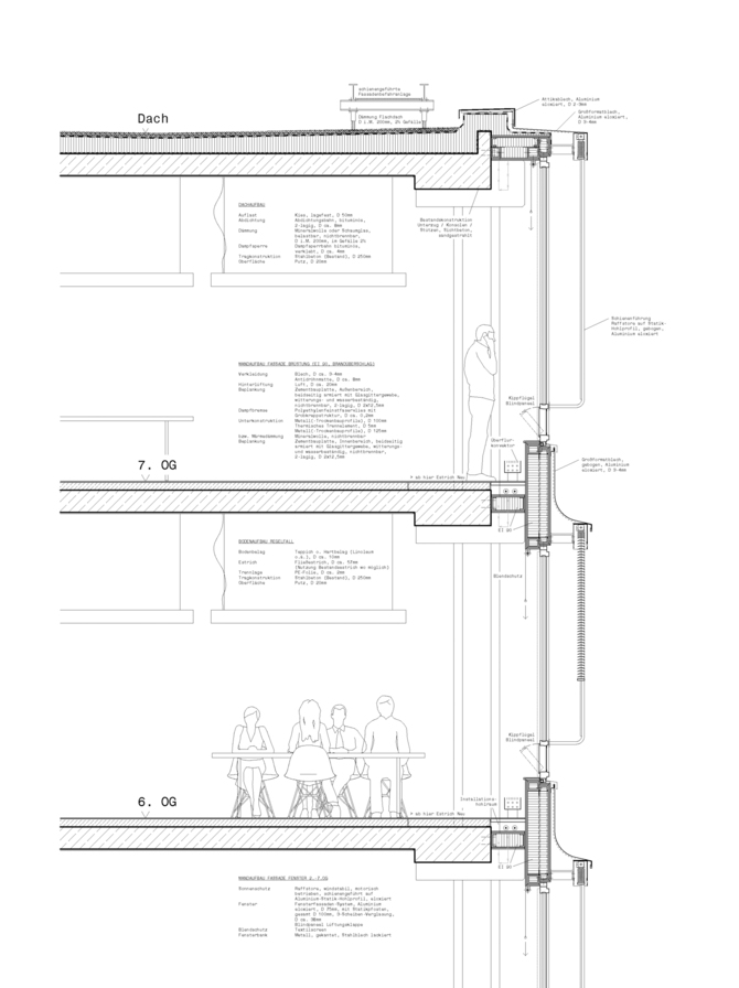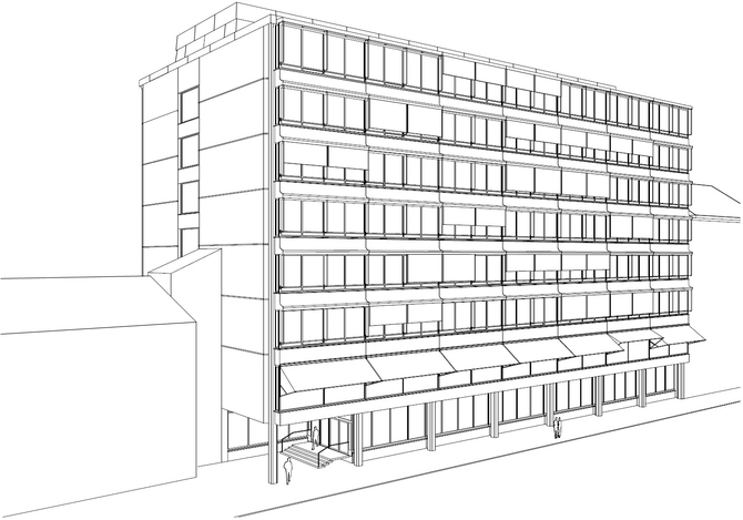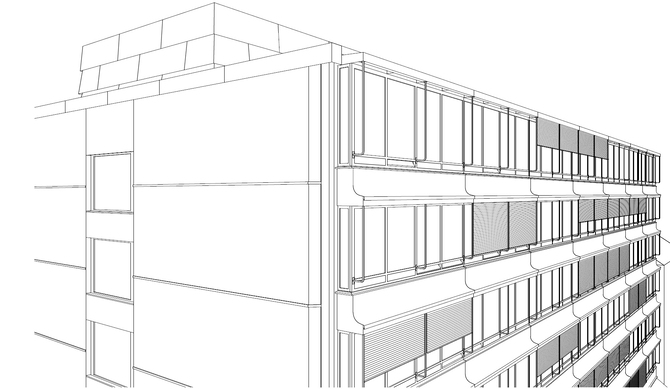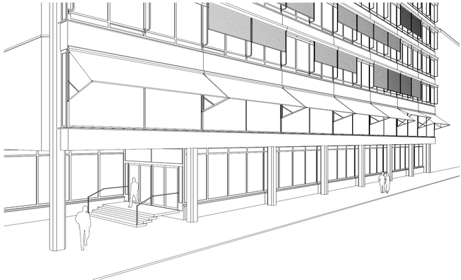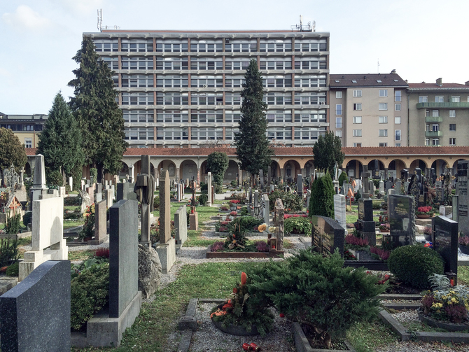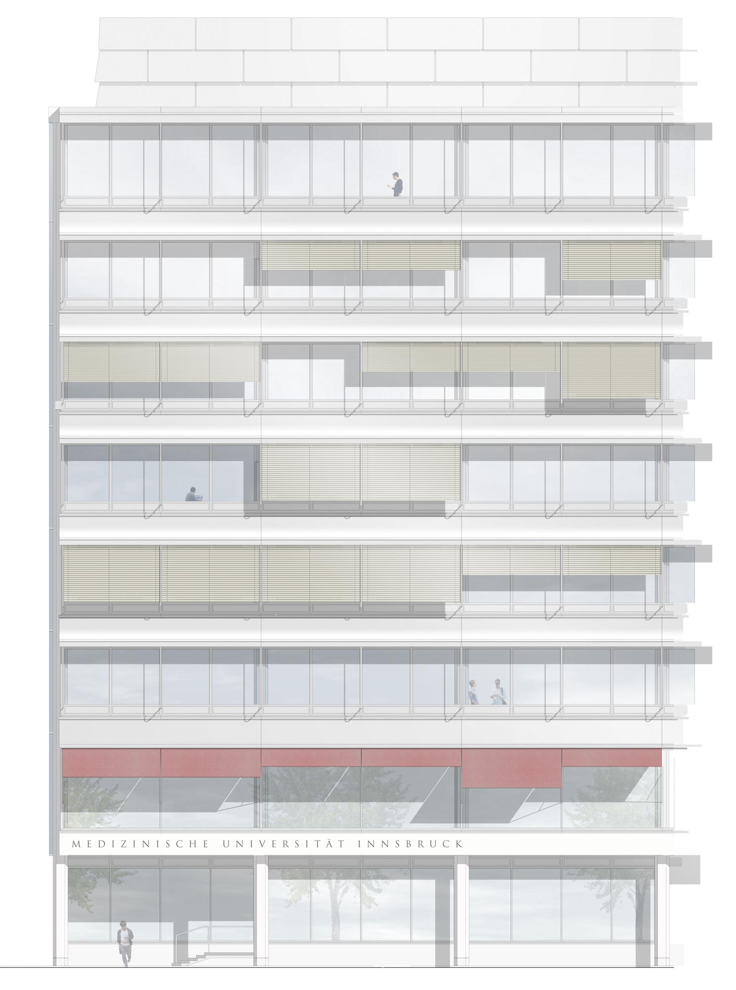 The building of the Medical University of Innsbruck was built in 1975, being a typical example of university architecture of its time. Its quality lies in its robust concrete structure as well as its location opposite the Western Cemetery of Innsbruck. The project proposes to replace the existing concrete facade with a new, light aluminium cladding, that nevertheless maintains a plasticity and layering, avoiding an abstract flush skin. A new auditorium is excavated in the courtyard. The library is placed on the first floor, thus easily accessible from the ground floor and acting as a Belétage towards the cemetery.