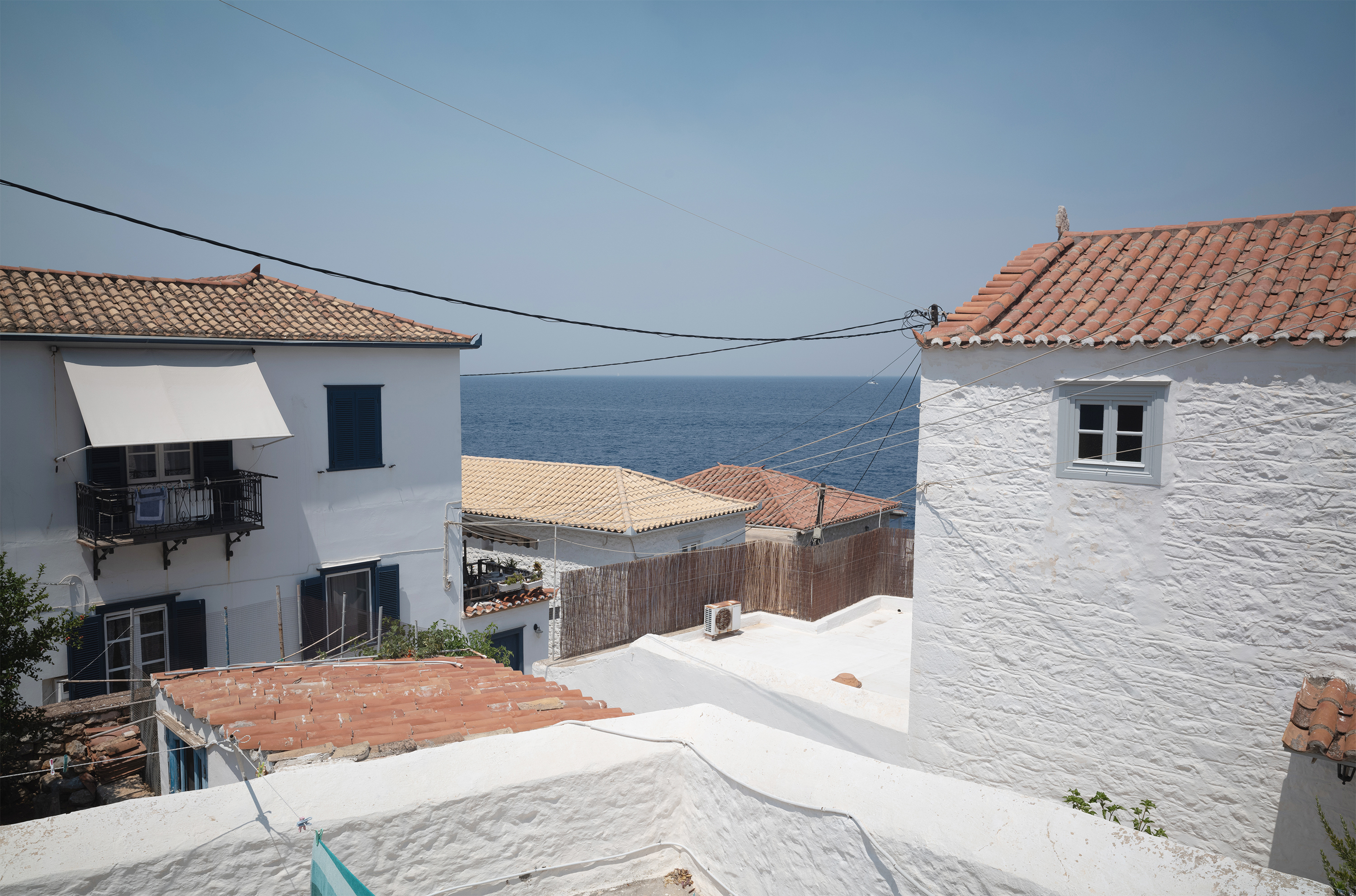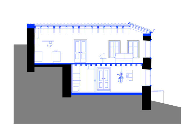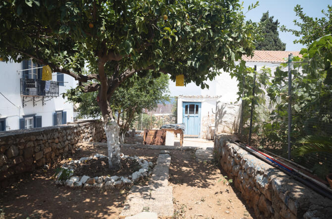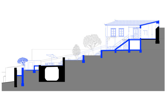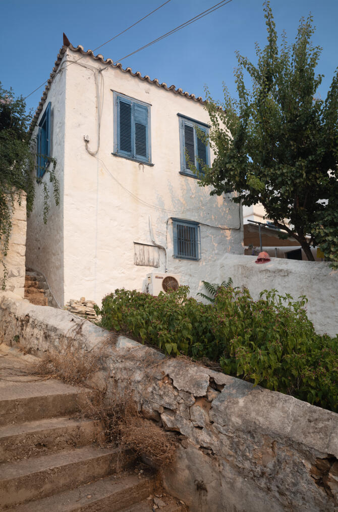 Conversion of a holiday home in Kamini, a small village on the island of Hydra. The existing building is located in the centre of the historic village on a long, narrow plot on a hill. The terraced garden extends along the topography, sloping from east to west below the house.