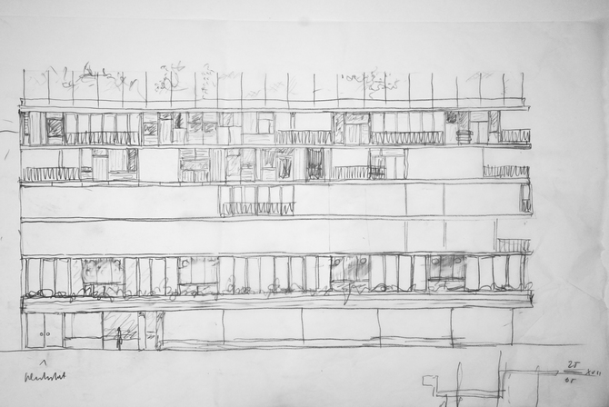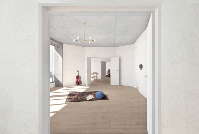 The newly founded housing cooperative "Kooperative Großstadt" wants to implement new forms of urban housing in its first project in Munich Riem: diverse apartment sizes and types, tested typologies as well as completely new concepts of transformable and adaptable forms of co-living shall be accomodated within a building volume predetermined by a masterplan. Our proposal is a first implementation of what we like to call an "inhabitable structure": A generic, flexible and robust load bearing concrete frame, that allows for the (random) accomodation of typologicaly heterogeneous flats, whose partition walls can be adapted or even completely replaced in the long run. The facade is conceived with prefabricated wooden elements that come delivered to the construction site with windows and sun protection integrated and are merely assembled (and later disassembled) on site.
