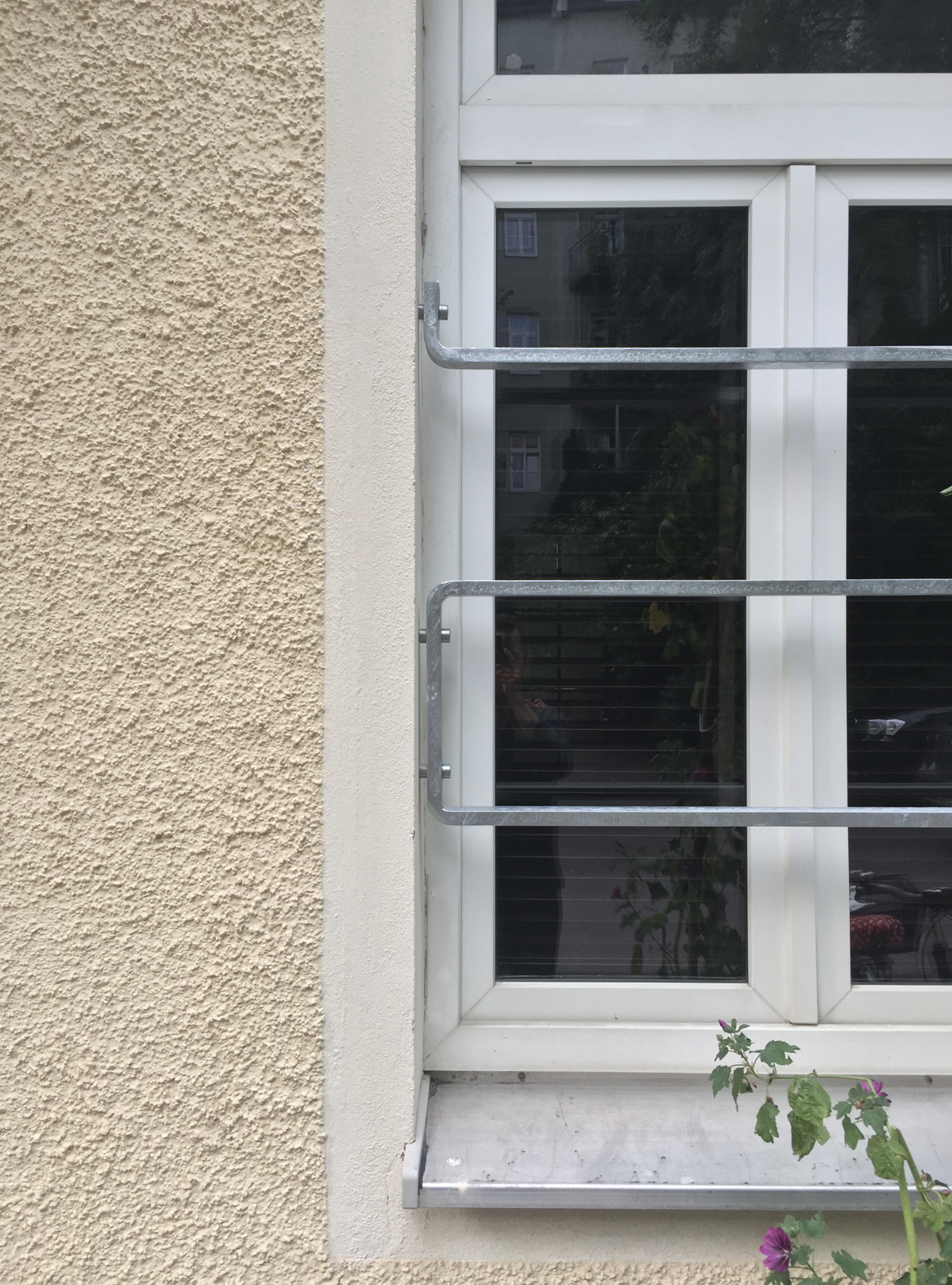 The foundation's offices are located in the courtyard wing of a listed house from 1899. On the one hand, the ground-floor location created the need for grating of the windows adjacent to the southern, publicly accessible courtyard. On the other hand, a new doorway with connecting stairs to the protected northern courtyard was desired. The added elements (lattice, staircase) follow a simple principle: all parts made of folded galvanized steel, one workpiece, visibly screwed without welded joints.