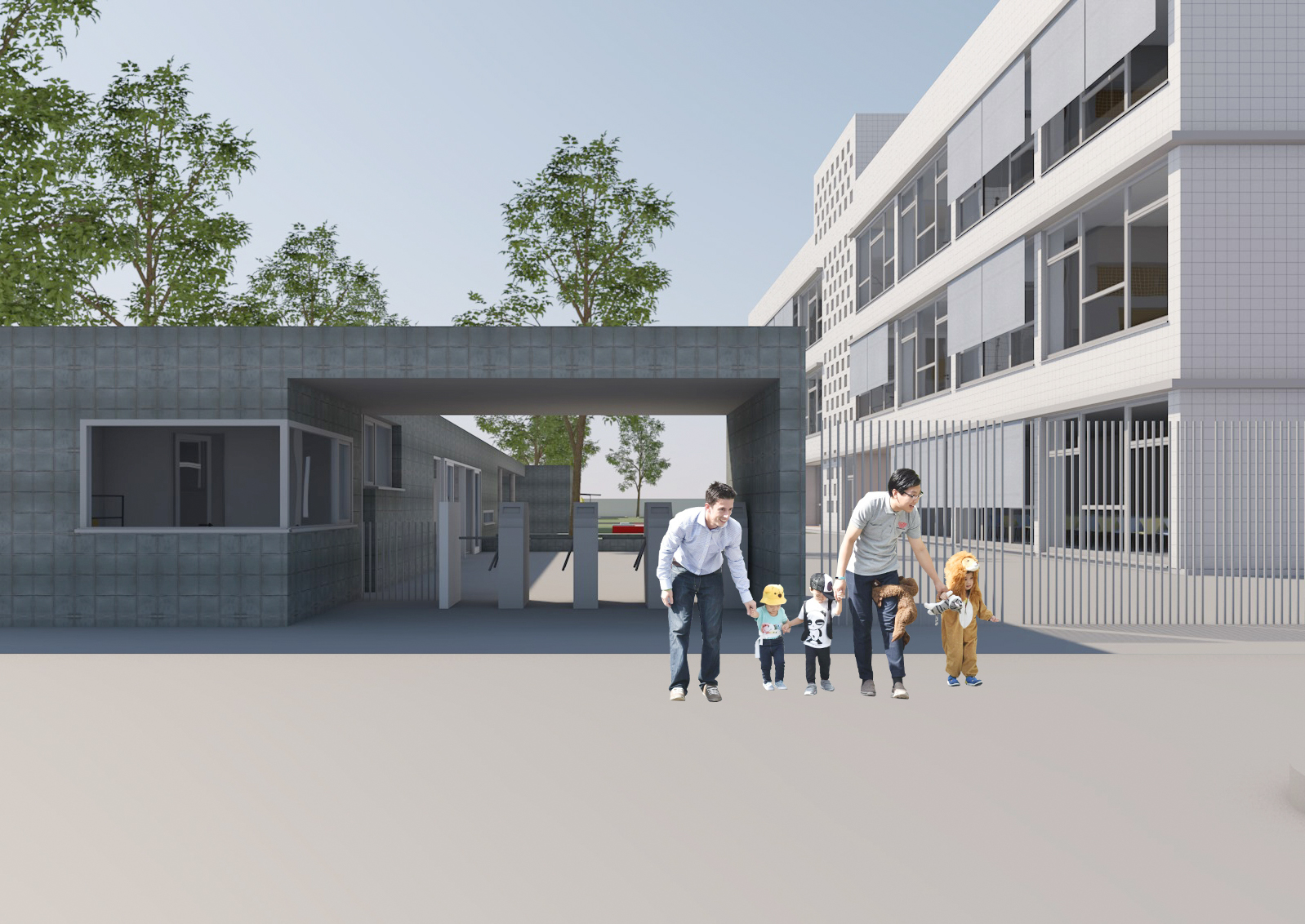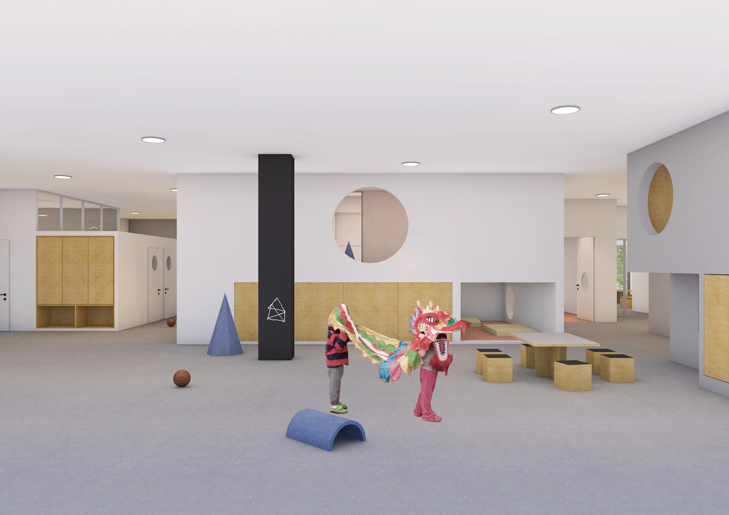 The former textile manufacture in the district of Hongqiao in the metropolitan Area of Shanghai will be transformed in order accommodate a large day care center for 400 children from the age of 0 to 6. The architetural concept follows and embodies the educational philosophy based on the concept of co-construction developed by Prof. Dr. Wassilios E. Fthenakis. The challenge resides in transforming the poorly lit and worn down building structure into a child friendly environment, without loosing the industrial character and loft-quality of the structure. The large floor plates are structured by three new staircases and an atrium. The groups of the children are structured by light built-in alcoves that group like houses in a village around a common central space, the "Piazza".